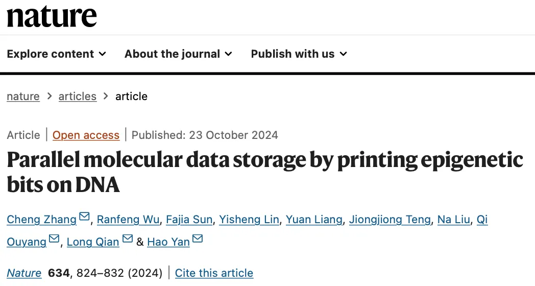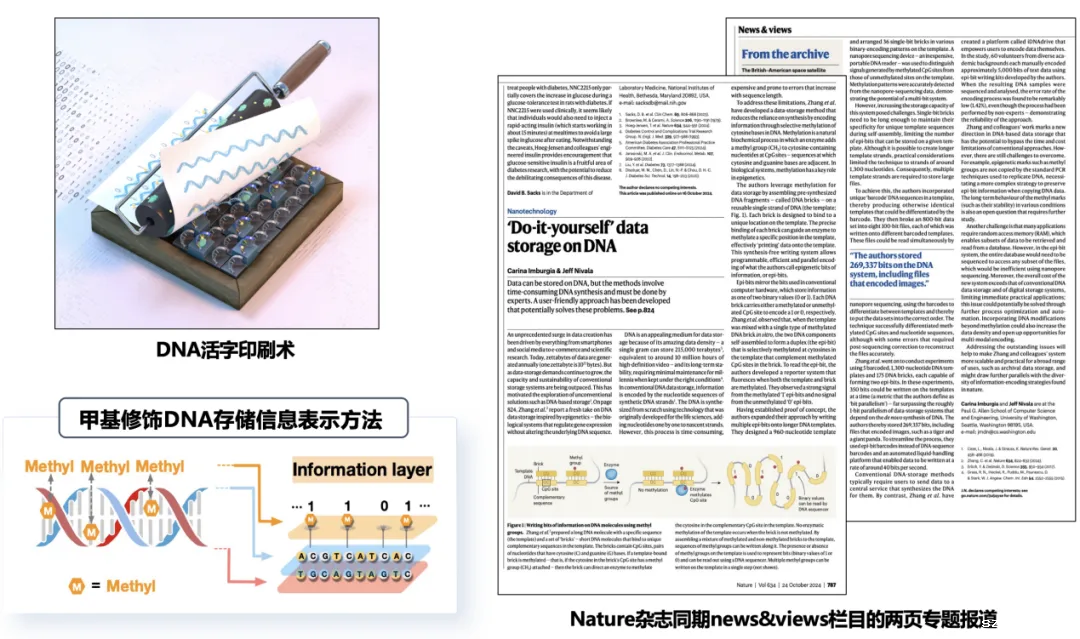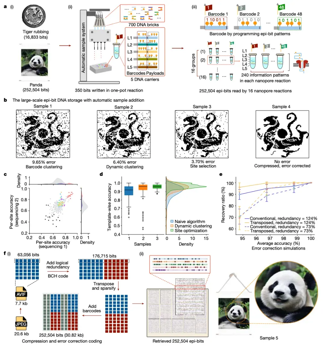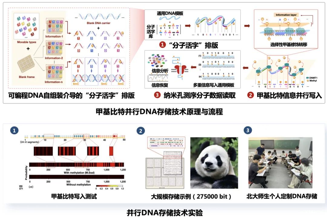 2024年10月23日,北京大学计算机学院张成与定量生物学中心钱珑联合研究团队与合作者,在国际学术期刊Nature上发表题为“Parallel molecular data storage by printing epigenetic bits on DNA”的研究论文,首次提出了一种基于并行写入策略的DNA存储策略,成功将信息打印在DNA分子之上,犹如“活字印刷”,在白纸上批量印刷信息。团队在实验中,成功将中国汉代“白虎”瓦当和大熊猫的高清图片(数据量超过27.5万比特)写入DNA分子中,并无损还原了原始数据,解析出高清图片。